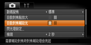 ),然後將 [自動對焦輔助光] 設定為 [開]。