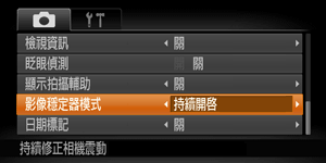 ),並將 [影像穩定器模式] 設定為 [持續開啟]。
