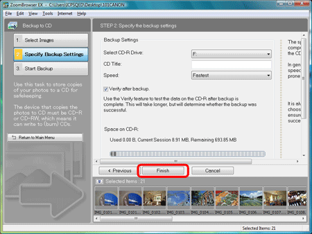 7. 按一下 [完成(Finish)] 按鈕。 開始寫入 CD-R/RW。