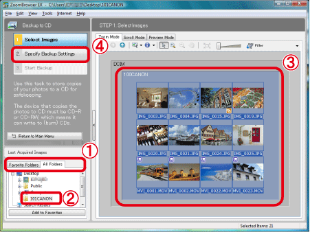 選擇影像。 要選擇多個影像,按住鍵盤上的<Ctrl>鍵再按各個影像。 按住資料夾的空白部份可選擇資料夾中的全部影像。選擇要儲存至 CD-R/RW 光碟的影像後,按一下