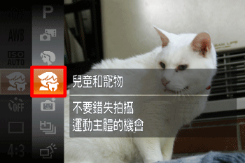 上下按 <方向按鈕> 選擇所需 [拍攝模式] (上圖中選擇了 [兒童和寵物] (