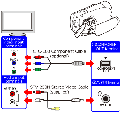 使用視頻色差連接線連接攝錄機和電視時,請使用隨附的立體聲視頻連接線輸出音頻。