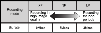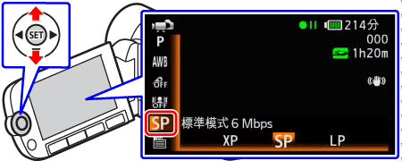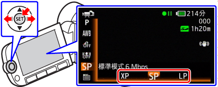 攝錄機可提供 3 種錄影模式。變更錄影模式將變更記憶體上的可用記錄時間。選擇 XP 模式可獲得更好的影片畫質;選擇 LP 模式可記錄更長時間。下表提供了大約的記錄時間。