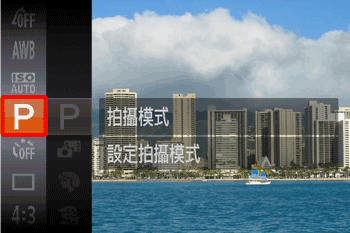 上下按 <方向按鈕> 選擇 [拍攝模式]。(如果沒有更改過設定,將顯示 [程式 AE] (