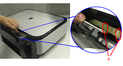 6. 用濕棉花籤或類似物品擦拭送紙滾軸轉軸的突起部分(A) 。