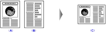 將「標準影印」中的「佈置」設定為「2 合 1 影印」時,可以透過縮小每頁影像將兩頁原稿 (A) (B) 影印到一頁紙張 (C) 上。