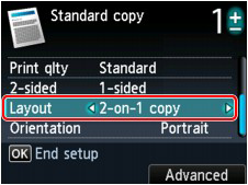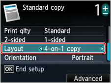 在影印待命螢幕上按右功能按鈕可顯示列印設定螢幕,然後將「佈置」設定為「4 合 1 影印」。