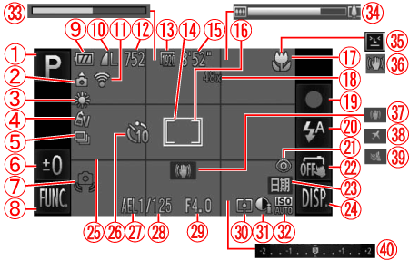 ![]() | 電池充電指示燈 | ![]() | 光圈值 |