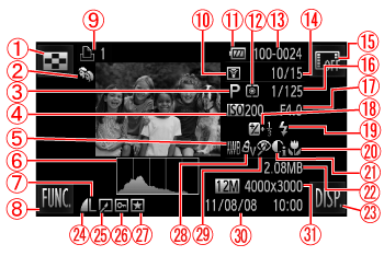 ![]() | 顯示的影像編號/影像總數 | ![]() | 拍攝日期及時間 |