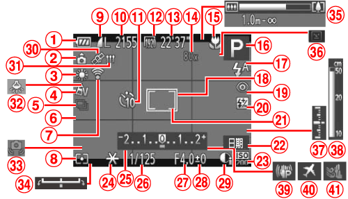 ![]() | 拍攝模式、場景圖示 | ![]() | 曝光等級 |