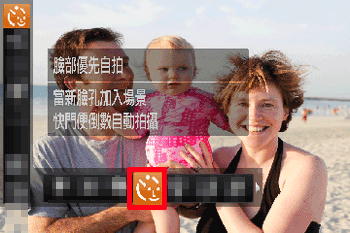 相機會在偵測到其他人的臉部 (如拍攝者) 進入拍攝區域約兩秒鐘後進行拍攝。想要將自己加入集體照或類似拍攝場合時,此功能會很有用。