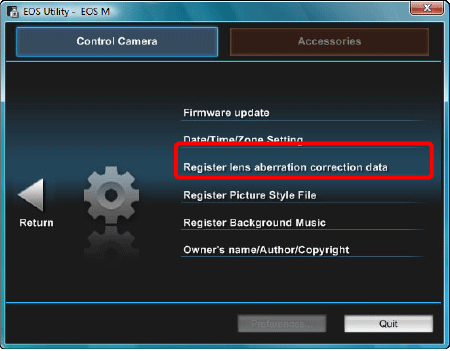 使用隨附的 EOS Utility 軟件,您可以在相機中註冊鏡頭周邊亮度校正資料或將其從相機中刪除。
