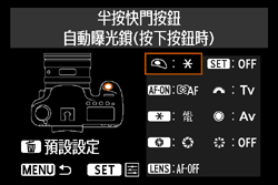 這種情況下,半按快門按鈕時,相機設定為鎖定自動曝光 (固定曝光)。