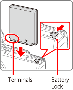 - 如果以錯誤方向插入電池,則電池無法鎖定到正確的位置。插入電池時,請隨時確認電池以正確方向鎖定到位。