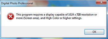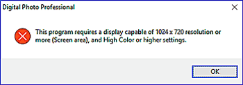 顯示器的解像度設定為低於 1024 × 720 或色彩設定低於「高彩 (16 位元)」時,Digital Photo Professional 無法運行。