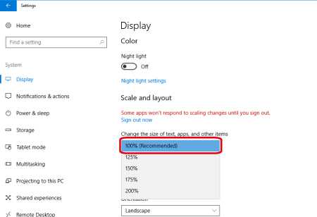 如果大小未設定為 [100% (推薦)],選擇 [100% (推薦)],然後按一下 [立即登出 (Sign out now)]。