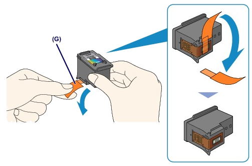 (1) 從包裝中取出新的 FINE 墨盒並輕輕撕下保護膠帶 (G)。