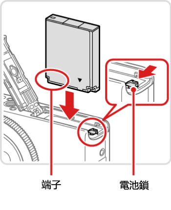 如果以錯誤方向插入電池,則電池無法鎖定到正確的位置。插入電池時,請隨時確認電池以正確方向鎖定到位。