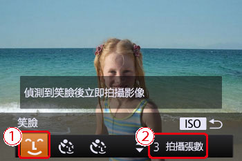 ) 按鈕。( ) | 即使沒有按快門按鈕,相機偵測到笑臉時,即會進行拍攝。 | - 每次相機偵測到笑臉,都將在指示燈亮起後進行拍攝。 - 如果未偵測到笑臉,面對相機並咧嘴微笑將使相機更容易偵測到笑臉。 - 拍攝完成後,應切換至其他模式,否則相機會繼續在偵測到笑臉時拍攝。 - 也可以透過按快門按鈕進行拍攝。 |