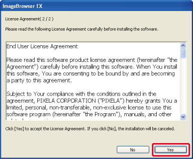 13. 安裝 ImageBrowser EX 時,連接至互聯網的電腦上會出現以下螢幕。如同意免責聲明,按一下 [是 (Yes)]。