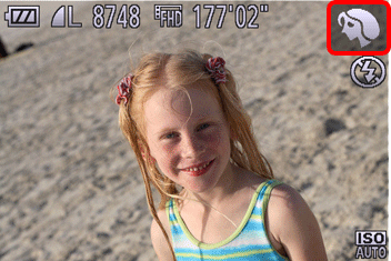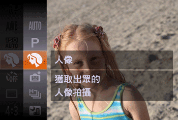 > 按鈕選擇所需拍攝模式。 (以下範例影像中已選擇 [人像] (