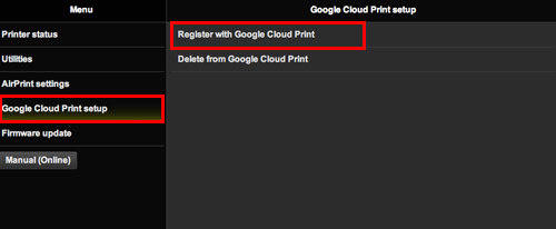 6. 選擇 [Google 雲端列印設定 (Google Cloud Print setup)] -> [透過 Google 雲端列印註冊 (Register with Google Cloud Print)]。
