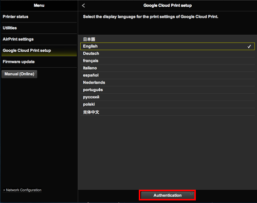 8. 在 Google 雲端列印的列印設定中,選擇顯示語言,然後選擇「驗證(Authentication)」。