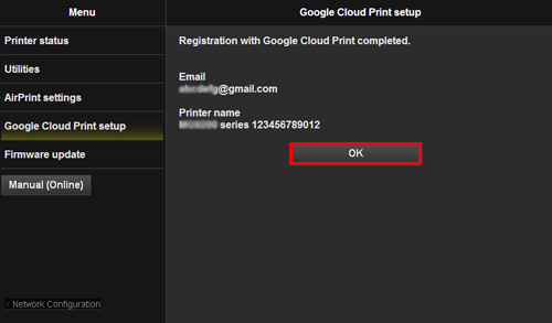 11. 在遠端用戶界面中,確認已顯示「透過 Google 雲端列印註冊完成 (Registration with Google cloud Print completed)」,然後選擇「確定(OK)」。
