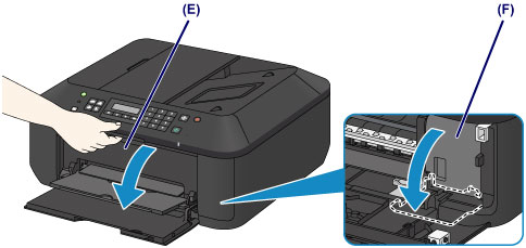 2. 開啟出紙蓋板 (E)。