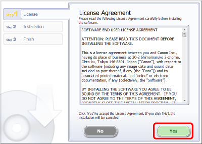 9. 閱讀許可協議,如果同意這些條款,則按一下 [是 (Yes)] 以開始安裝。