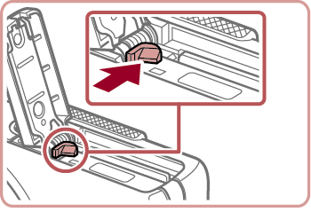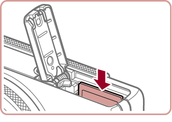 ) 朝向如圖所示方向,直至記憶卡喀噠一聲鎖定到位。 - 確保以正確方向插入記憶卡。以錯誤方向插入記憶卡可能會損壞相機。