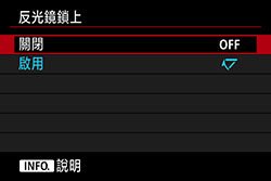 :反光鏡鎖上] 設定。如此設定已設定為 [啟用],請將其變更為 [關閉] 以關閉反光鏡鎖上功能。
