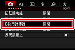 - 執行任何以下操作將會取消 B 快門計時器作業 (狀態會還原為 [關閉]):設定電源開關為 <OFF>,顯示短片拍攝螢幕,或從 <B> 變更拍攝模式。