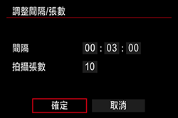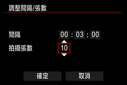| 拍攝數量 | 可設定為從 [01] 至 [99]。如果設定為 [00],相機會繼續拍攝直到您停止間隔計時器為止。 |