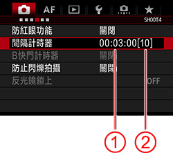 - 如果執行以下任何操作,間隔計時器拍攝將會取消並重設為 [關閉]:將電源開關置於 <OFF>、顯示即時顯示或短片拍攝畫面、將拍攝模式設定為 <B> 或自訂拍攝模式,或使用 EOS Utility (EOS 軟件)。