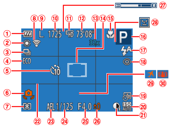 ![]() | 電池電量 | ![]() | 拍攝模式、場景圖示 |