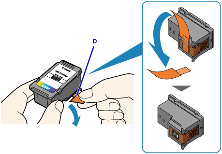 6. 從包裝中取出新的 FINE 墨盒並輕輕撕下保護膠帶 (D)。