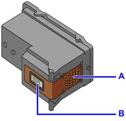 - 請勿接觸 FINE 墨盒上的電氣觸點 (A) 或列印頭噴嘴 (B)。如果觸摸,本機可能無法正常列印。