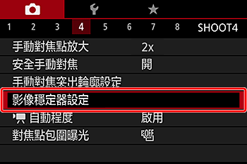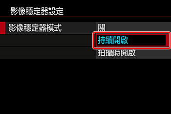 - 將 [影像穩定器模式] 設定為 [持續開啟]。