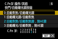 2. 選擇 [C.Fn IV:操作/其他] 下的 [6:快門/自動曝光鎖按鈕],並選擇 [0:自動對焦/自動曝光鎖]。
