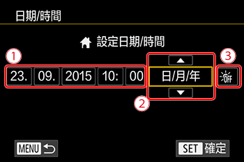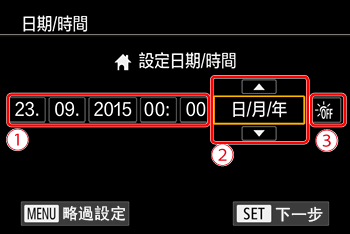 開機時,如螢幕顯示 [日期/時間] 畫面,請如下正確設定當前的日期及時間。您所指定的資訊會在拍攝時記錄為影像內容,而以拍攝日期管理影像或打印有日期的影像時將使用這些資訊。
