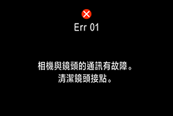 | Err 01 | 相機與鏡頭的通訊有故障。清潔鏡頭接點。 | ・清潔相機和鏡頭上的電子接點。 ・使用佳能鏡頭。 ・取下並重新安裝電池。 ・如果執行以上操作後問題仍然存在,請聯繫最近的佳能客戶服務中心。(*1) |