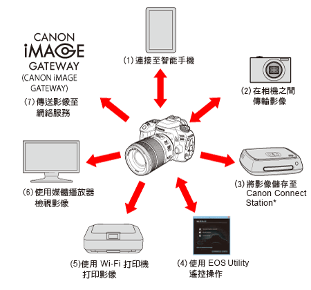 只需連接到 Wi-Fi 網絡或支援該相機無線功能的其他裝置,即可利用該相機的無線功能以無線方式執行多種任務 (從傳送影像至網路服務與其他相機,到從遠端控制相機等)。
