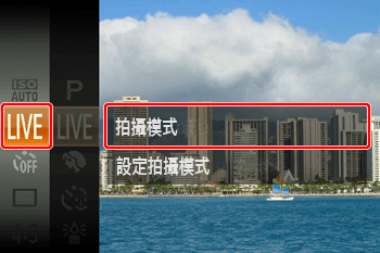 ] 按鈕直至出現 [ LIVE ] 模式*。*相機銷售後,[LIVE] 模式作為預設模式顯示。如果從未變更過設定,將顯示所選擇的拍攝模式。