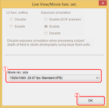 7. 出現 [即時顯示/短片功能設定 (Live View/Movie func. set)] 視窗,選擇短片記錄尺寸 (