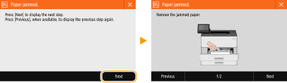 如果出現夾紙,螢幕上會顯示 <夾紙 (Paper jammed.)> 訊息。選擇 <下一步 (Next)> (