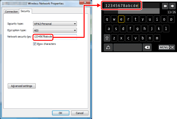 19. 輸入 [網路安全性金鑰 (Network security key)] 中顯示的密碼。(請參閱下方的密碼範例)。